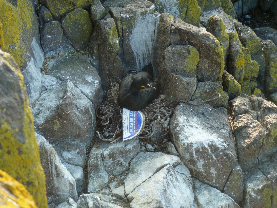 Not one to be content with a bare ledge or a standard nest like other seabirds, shags have an eye for the unusual. Although their main nesting materials are sticks and seaweed, they often amuse us with their little flourishes. Anything ‘stick-like’ seems to attract their attention, with garden canes, cutlery and paintbrushes (unfortunately for the contractors who were painting the Low Light) being prominently displayed. Others appear to have an eye for colour, using different pieces of old rope to produce a bold rainbow effect to their (not-so) humble abode. Among the more unusual items are: a doll, some garden hose, a toy lobster and a padlock! Carrie and Katherine, two of the seabird researchers, have provided the pictures for today’s blog – see if you can spot the unusual things these birds have been attracted to.